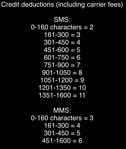 SMS Outgoing Message Prices are 2 cents/2 credits including carriers fees (up to 160 characters) no images and/or media (this includes letters, numbers, spaces and punctuation) Full character breakdown below.